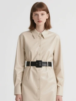 Beige Faux Leather Shirt Dress with Belt - Classic Style for Office or Casual Wear
